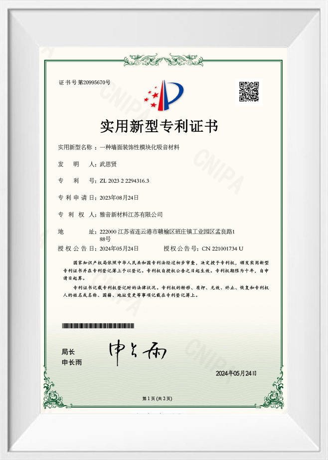 Patentsertifikat for et modulært lydabsorberende materiale for veggdekorasjon