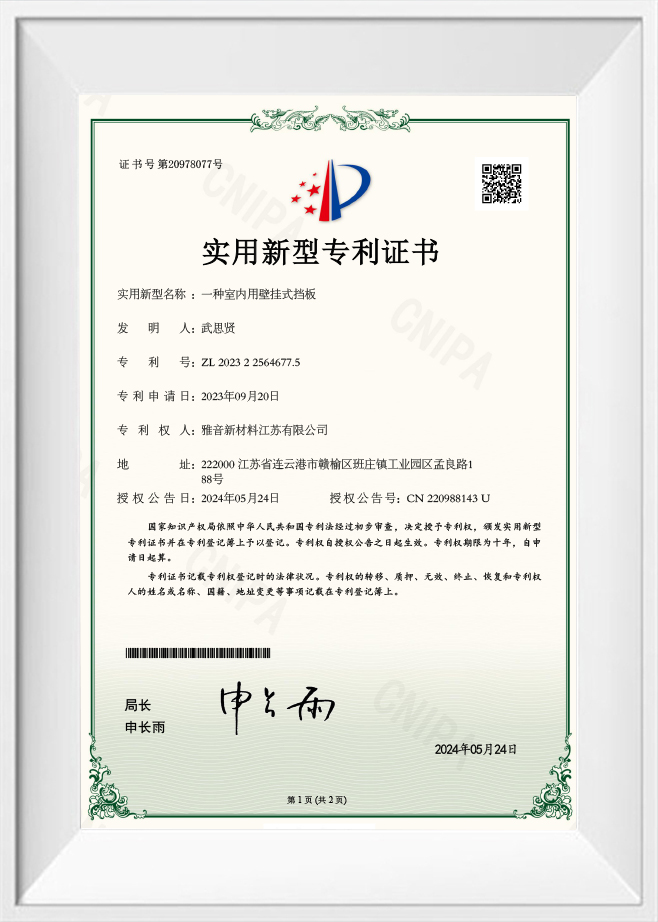 Patentsertifikat for veggmontert baffel for innendørs bruk